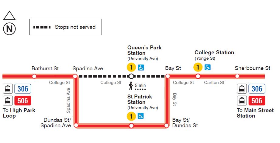 As of October 12, 2025, the City of Toronto and Toronto Transit Commission have begun streetcar track replacement at the intersection of College Street and McCaul Street. Due to these infrastructure upgrades, 506/306 Carlton streetcars are currently diverting around the area.