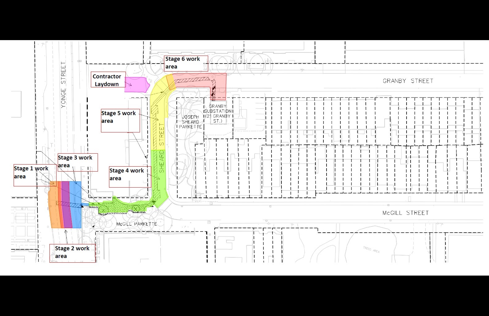 Stage 5: Granby Street and Sheard Street. Closure of a portion of Sheard Street and partial sidewalk closures on the west and east sides of Sheard Street adjacent to occupation. Pedestrian clearway maintained around the occupation on the west side of Sheard Street and through Joseph Sheard Parkette on the east side of Sheard Street.